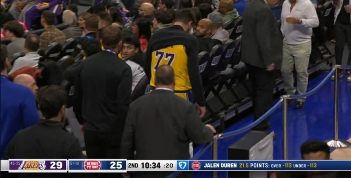 第二节湖人进攻停滞并且被活塞反超比分,7分24秒东契奇重返赛场,可他在场上状态全无,湖人一直被压制且单节25-42净输17分;次节东契奇饱受伤病的困扰,4投0中一分未得,半场打完湖人52-65落后13分。